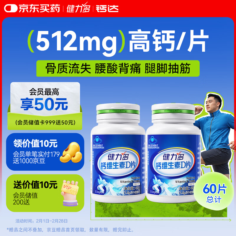 健力多钙片维生素D 30片*2瓶 39.9元特惠装!折19.9元/瓶超值抢购