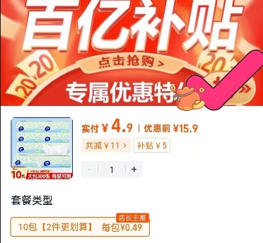 部分叠老客5元,下拉详情页百亿补贴页拍,实付4.9元包邮,折0.4/包,维达细韧抽纸100抽10包