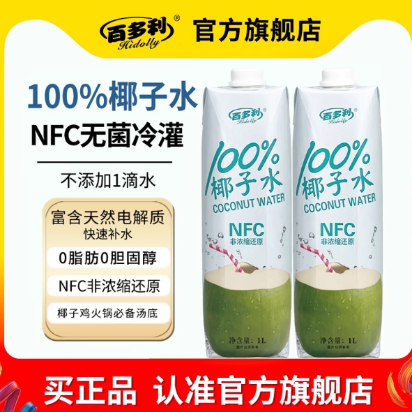 13.3元包邮!百多利100%椰汁nfc椰水 1L*2大瓶