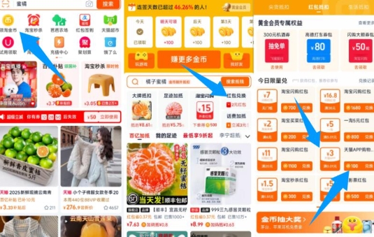 1、淘宝-首页-淘金币-如图鸿包兑换-进入-100金币兑3天猫红包: