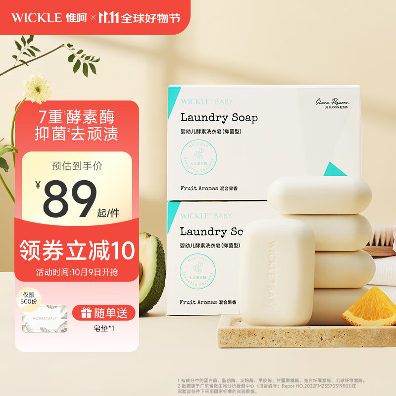 ¥59 WICKLE婴儿洗衣皂新生婴儿宝宝专用衣物护理酵素抑菌洗衣皂 自然皂150g*5/盒(2盒组合装) 99