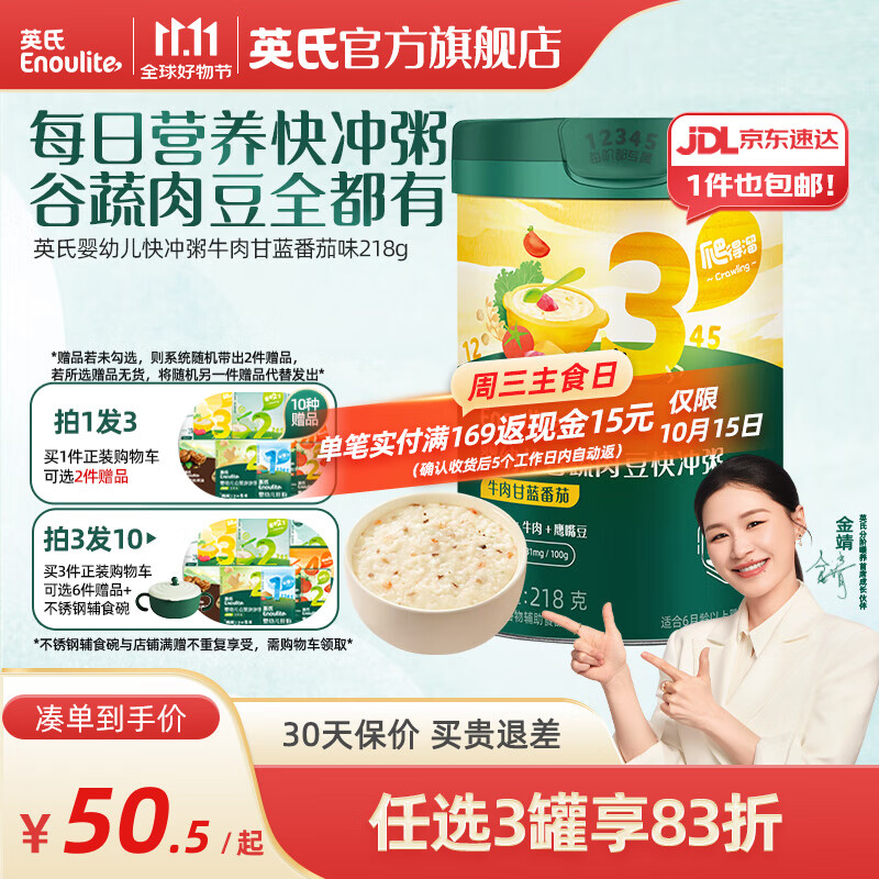 ¥52.9 英氏婴幼儿谷物牛肉快冲粥营养即食婴儿冲泡粥宝宝辅食粥 【新品】牛肉甘蓝番茄味 218g*1罐 60.9