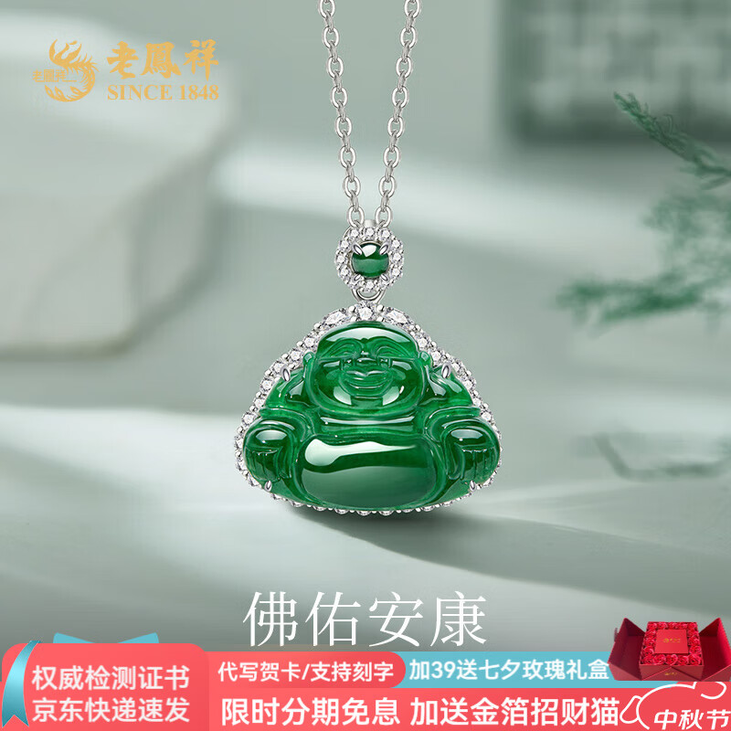 ¥819 老凤祥危料翡翠弥勒佛吊坠危地马拉绿翡翠玉坠送女友老婆中秋节生日礼物 银镶翡翠吊坠+金色银链+证书 839