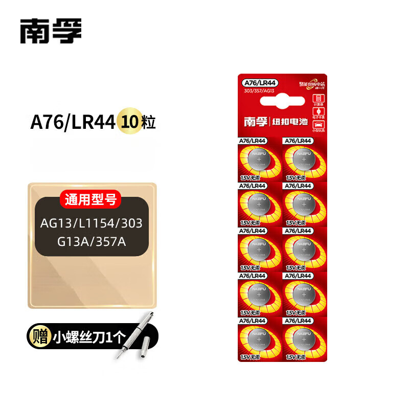 ¥20.9 南孚【甄选厂家】电子A76/LR44纽扣电池AG13/L1154/357a/SR44小电子玩 A76/LR44【10粒】 50.9