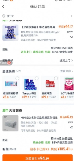 在售价89.9元,领1元礼金+5元券,先收藏,参与满1件打9.5折,立减10.79元,199-35优惠活动,天猫超市直播间加购一件补贴6.5元,88VIP消费券一件9折,淘金币频道再加购两件,购物车-1,淘金币抵扣9.88元,叠凑单1件+品牌金,折维达42.17元/件;