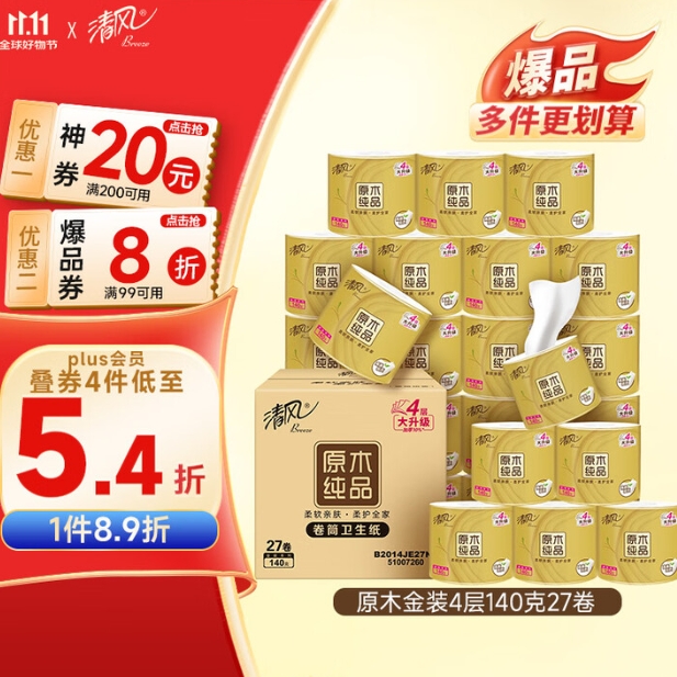 28.7元!清风 卷纸 原木金装 4层140g27卷