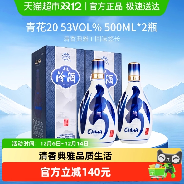 674元!汾酒 青花20 53%vol 清香型白酒 500ml*2瓶