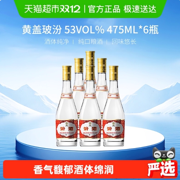 214元!汾酒 黄盖玻汾 53%vol 清香型白酒 475ml*6瓶