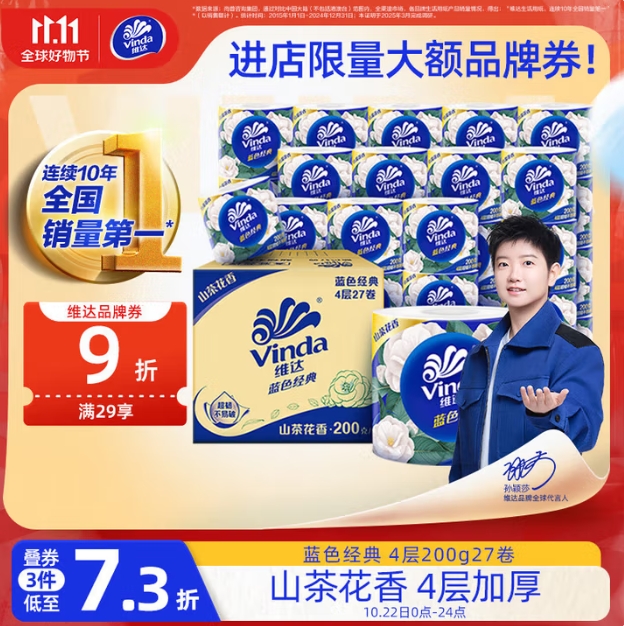 39元!维达 有芯卷纸 蓝色经典4层200克*27卷(返10元E卡后)