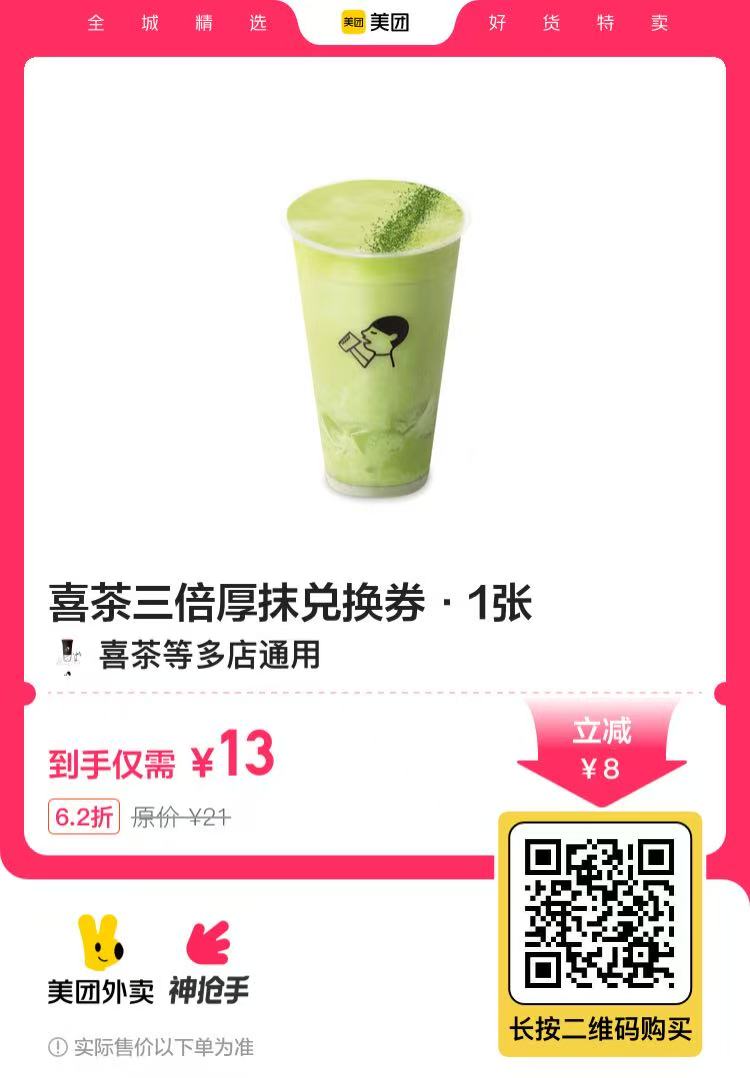 【美团外卖】13元!喜茶|喜茶三倍厚抹兑换券