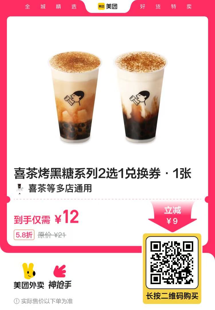 【美团外卖】12元!喜茶 烤黑糖系列2选1兑换券
