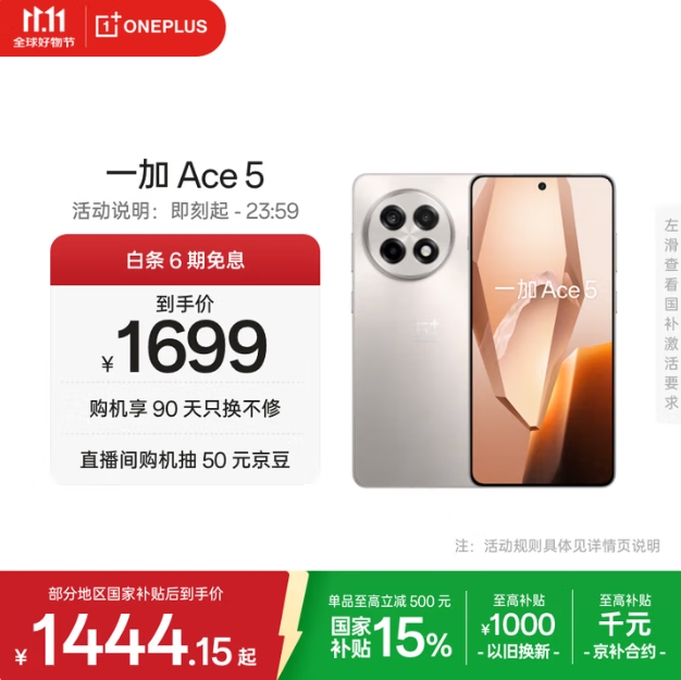 1394元!一加 OnePlus Ace 5 5G手机 12GB+256GB 引力钛 第三代骁龙8