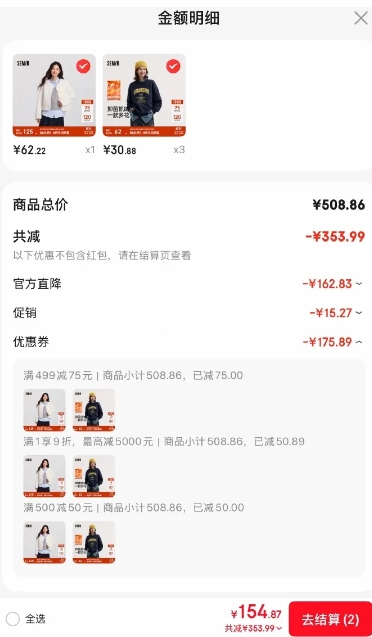 森马有4件97折,页面领券: