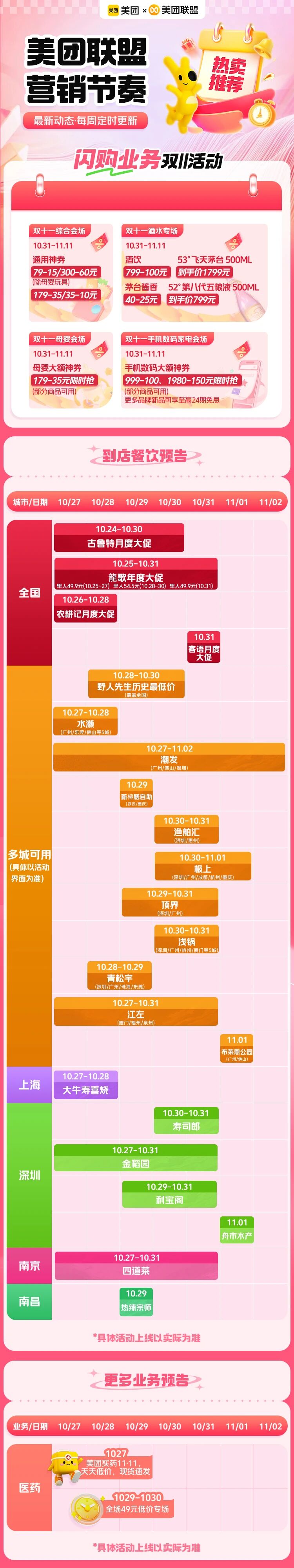 美团 2025 年双十一大促延续 “全场景优惠” 特色,覆盖外卖、美食、酒店旅游、买药等核心板块,活动节奏以 “长周期预热 + 单日爆发 + 返场延续” 为主。