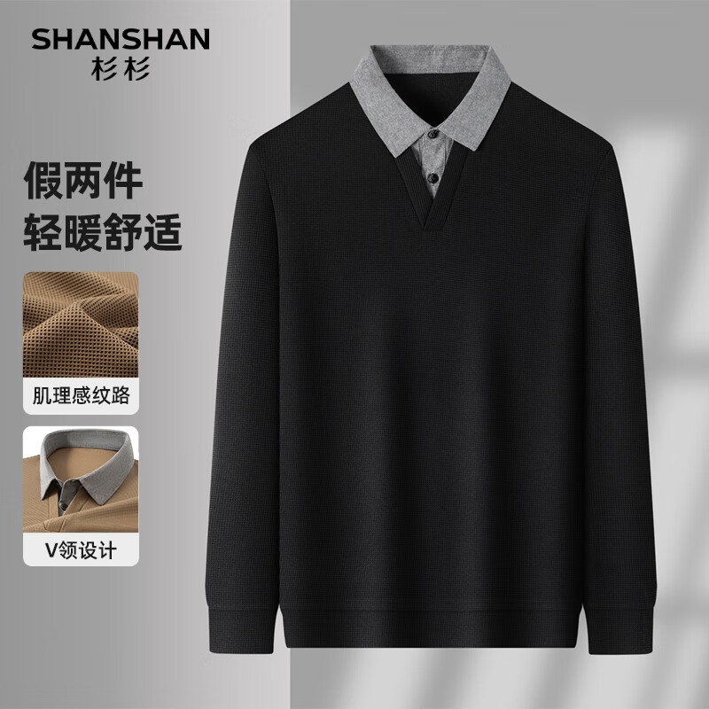 ¥204 SHANSHAN杉杉假两件长袖T恤男2025秋季商务休闲衬衫领打底衫肌理感内搭 黑色 L /175 214