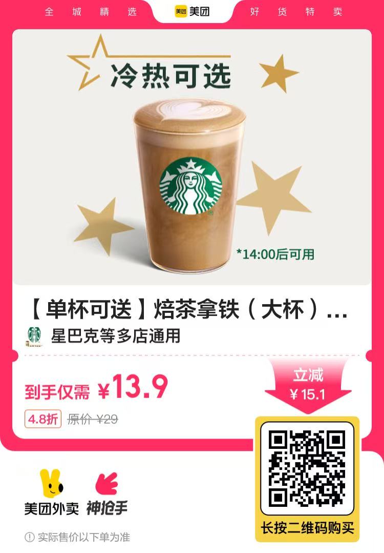 【美团】13.9元!星巴克 焙茶拿铁(大杯)