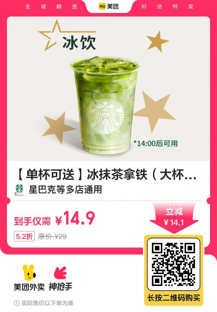 【美团】14.9元!星巴克 冰抹茶拿铁(大杯)