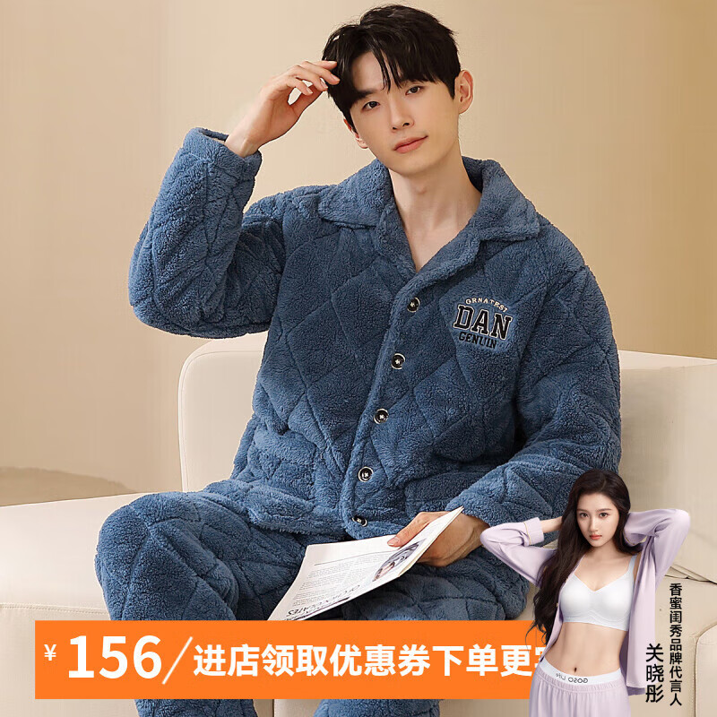 ¥89 香蜜闺秀【三层夹棉加厚】男士睡衣秋冬新款长袖可外穿保暖男士家居服套装 W3424013宝蓝 XL 209