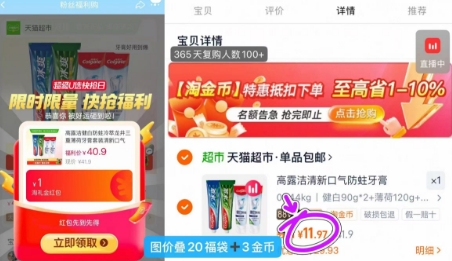 在售价41.9元,领1元礼金,商品页价格下拉详情页-淘金币跳转直播间灵2元券,88VIP下单,实付低至11.97元包邮;