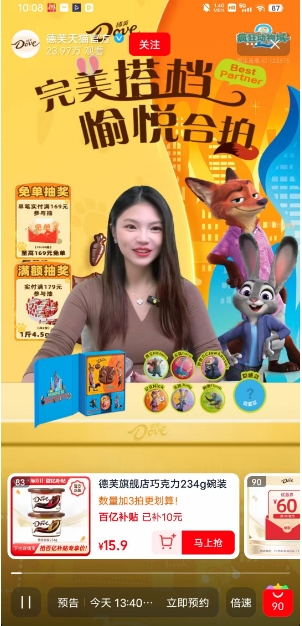 百亿补贴20.9元,商品页右上方直播间停留会弹5元新客券,下单实付15.9元包邮,德芙巧克力234g碗装