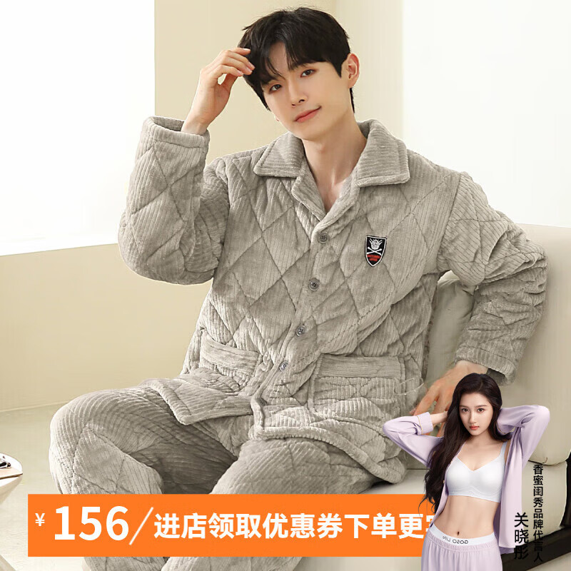 ¥89 香蜜闺秀【三层夹棉加厚】男士睡衣秋冬新款长袖可外穿保暖男士家居服套装 卡其 XL 209