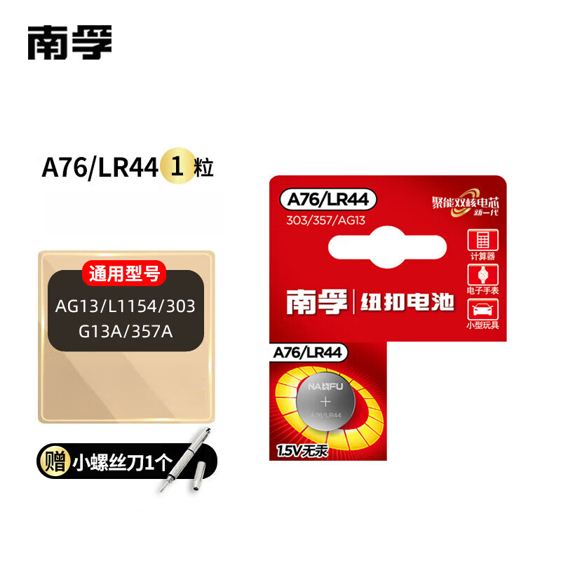¥9.9 南孚【甄选厂家】电子A76/LR44纽扣电池AG13/L1154/357a/SR44小电子玩 A76/LR44【1粒】 39.9