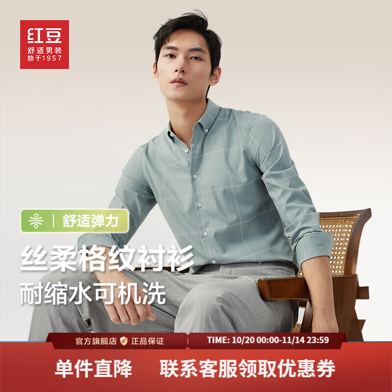¥139 红豆【莫代尔衬衫】衬衫男商务休闲格子衬衫男衬衣弹力垂顺衬衫男 G1【莫代尔】 春芽绿 40 149