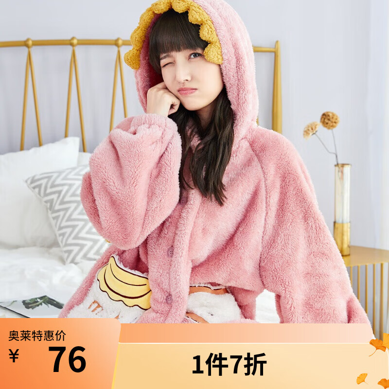 ¥82 都市丽人睡衣女卡通加绒加厚开襟连帽口袋女士家居服套装 藕粉 XL (建议120-135斤) 109