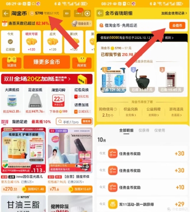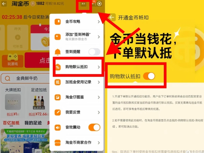 打开淘宝-首页-点击“领淘金币”-右上角“更多”-开启“购物默认抵扣”开关