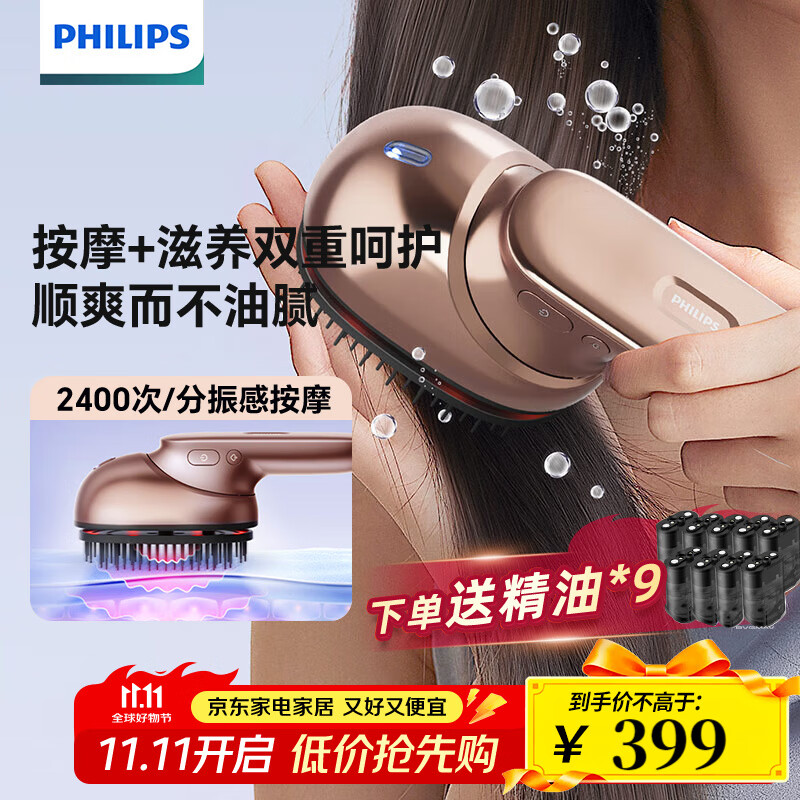 ¥199 飞利浦(PHILIPS)家用头皮按摩器  无线便携高频微震按摩 头皮护发护理柔顺可雾化精油 伴手礼物                                                449