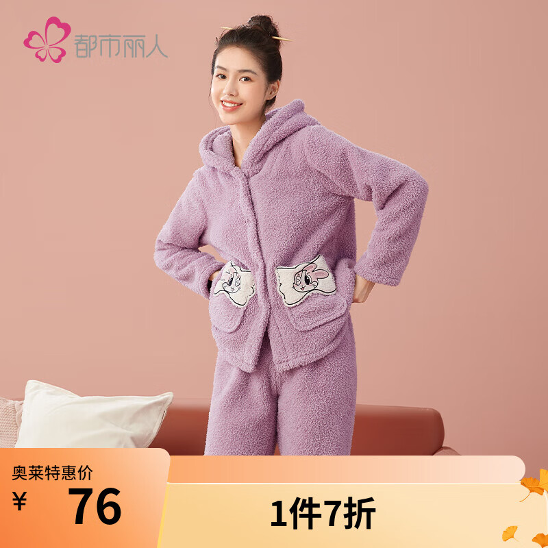 ¥82 都市丽人睡衣女卡通加绒加厚开襟连帽口袋女士家居服套装 藕粉 XL (建议120-135斤) 109