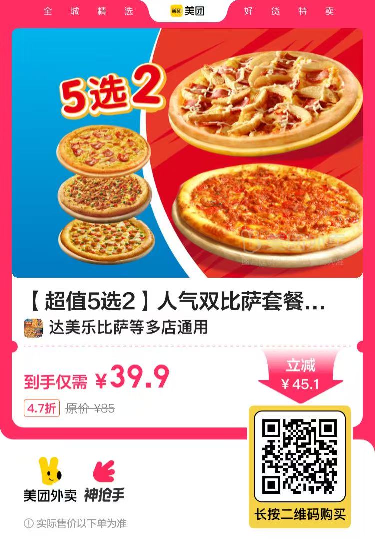 【达美乐】超值5选2双比萨套餐,现价仅需39.9元