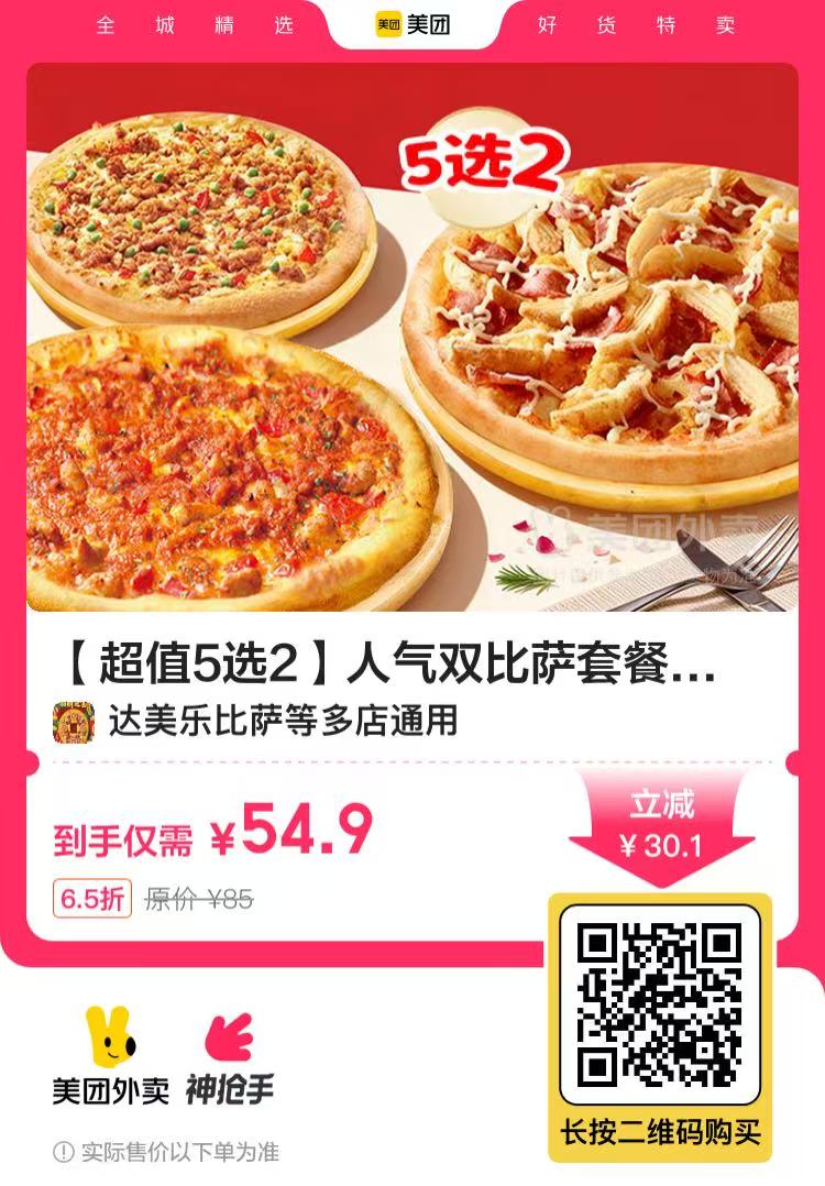 【达美乐】超值5选2双比萨套餐,现价仅需54.9元,7天有效期