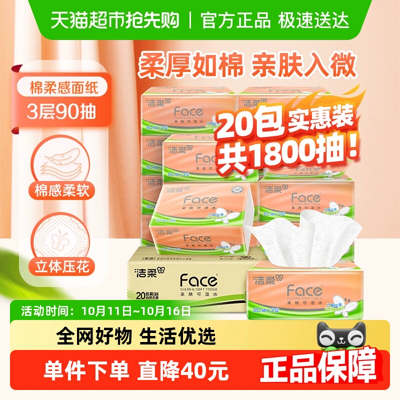 ¥16.36 0.6/包!洁柔抽纸立体压花绵柔3层90抽20包 16.36
