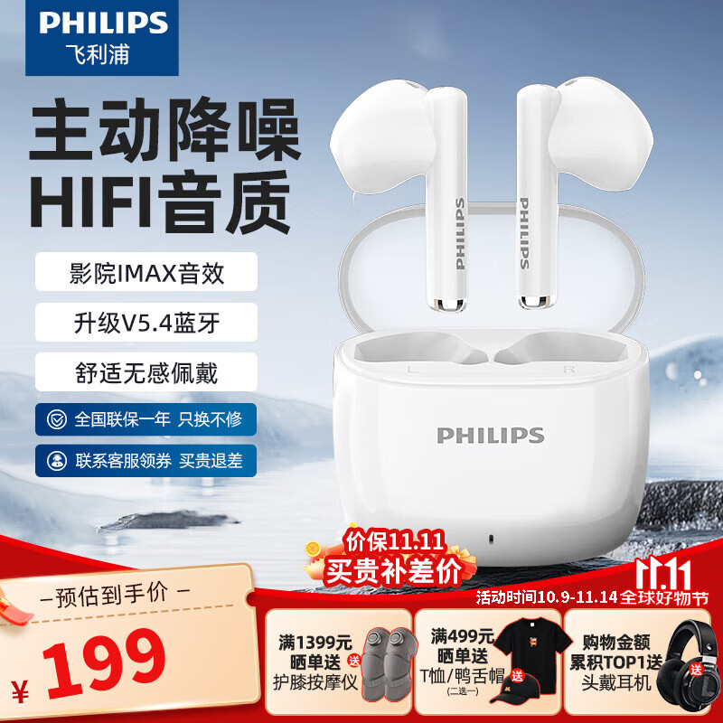 ¥82 飞利浦(PHILIPS)无线蓝牙耳机电竟耳机游戏耳机HiFi音质AI通话降噪入耳式蓝牙耳机超长续航大电量超强降噪运动 白色360°全景环绕音 199