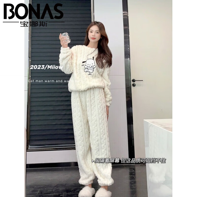 ¥32.9 宝娜斯卡通珊瑚绒长裤秋冬宽松束脚松紧腰懒人睡裤家居睡衣套装 白色-小狗提花 均码 (90-150斤) 59.9