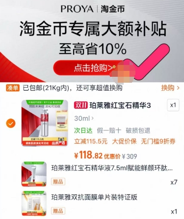 在售价309元,领9.67元礼金,领价格下方999-100元券,商品页价格下拉详情页-淘金币点进去加购1件,叠凑单一起,叠淘金币+88VIP消费券9折,折主商品118元,+赠7.5ml*7+面膜;