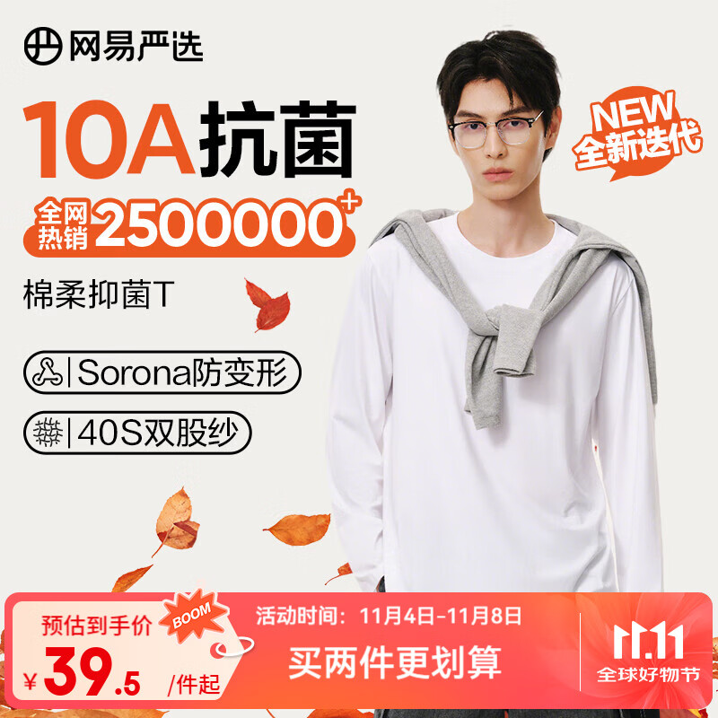 ¥59 网易严选25新品新疆棉长袖T恤10A抗菌万能打底衫不易变形男女同款 A款10A抑菌升级-本白色 L 69