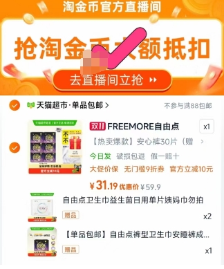在售价59.9元,领3元券+1.87元礼金,商品页价格下拉详情页-淘金币 跳转主播间下单,实付31.5元包邮,贈卫生巾2片➕安心裤5条
