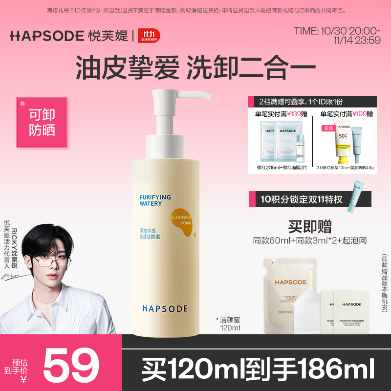 ¥58 悦芙媞控油洁颜蜜氨基酸洁面洗卸一体洗面奶学生礼物 120ml赠小样 69