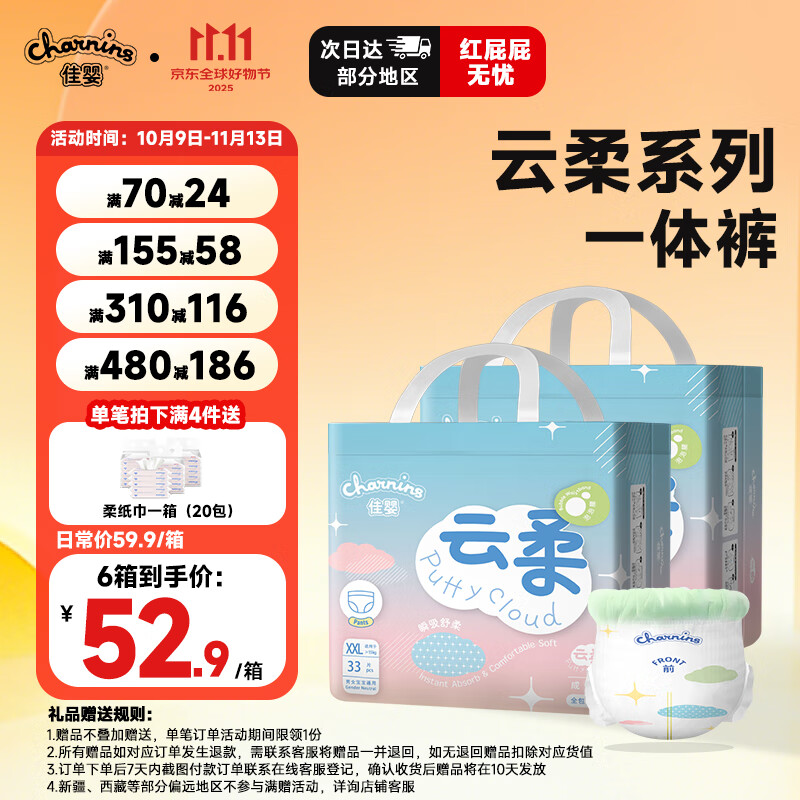 ¥78.9 佳婴云柔拉拉裤男女宝宝超薄透气成长裤干爽婴儿尿不湿小内裤式 XL码(9-14KG)72片 83.9