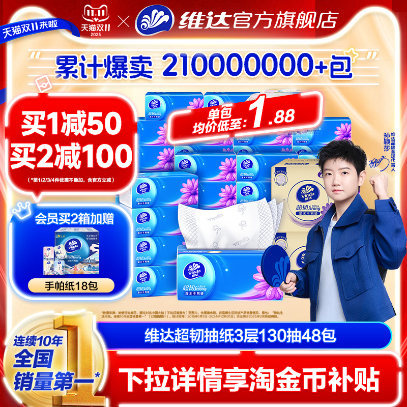 ¥44.9 3层130抽24包!维达抽纸超韧纸巾 49.9