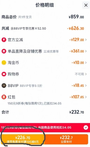 在售价859元,领130元券+73.8元礼金,商品页右上角三个点点进去-底部淘金币点进去-淘金币 我的足迹页拍,叠88VIP9折消费券+88VIP95折+淘金币+官方满减,实付232.7元包邮叠(付款页面免支付100-6元,价格还低);