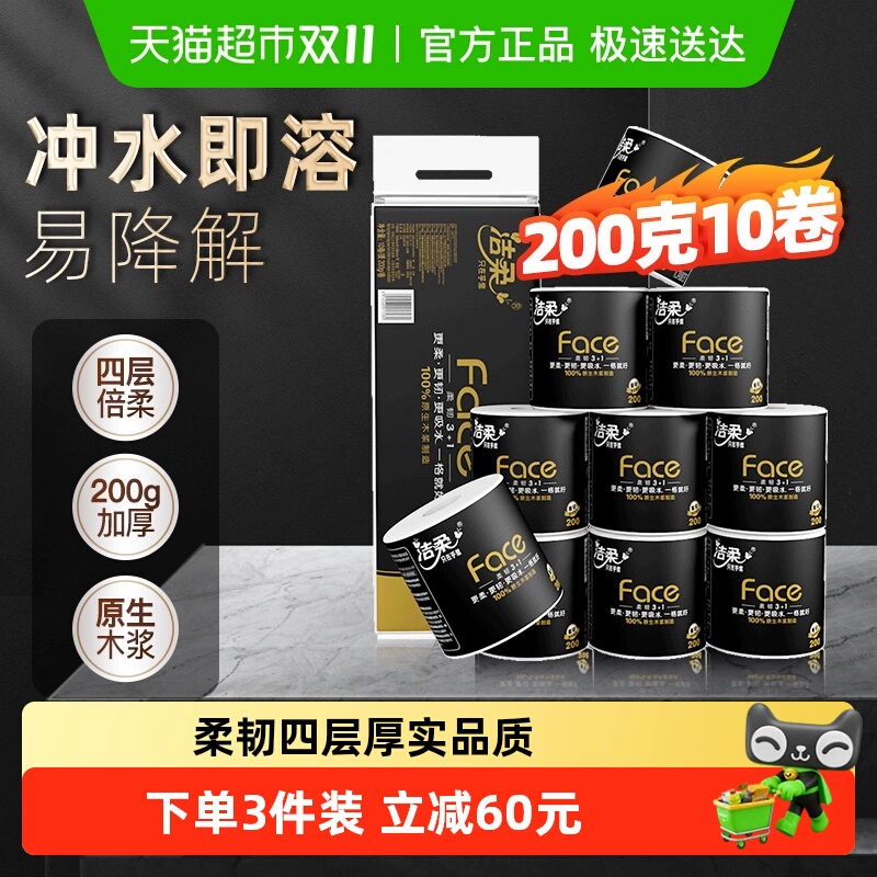 ¥50.7 3件50.7!洁柔黑Face4层有芯卷纸200g*30卷 53.7