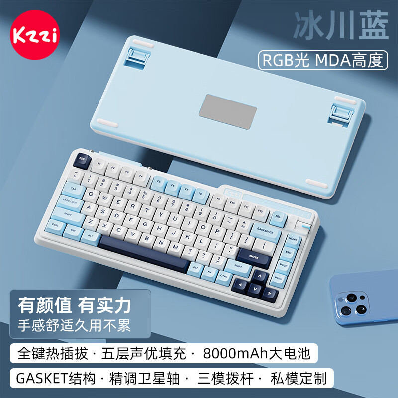 ¥179 KZZI K75V2 客制化三模机械键盘无线蓝牙有线gasket结构全键热插拔电竞游戏办公笔记本通用RGB灯效 冰川蓝【风雨轴V2】-8000毫安-三模 三模(有线/蓝牙/2.4G) 75%配列(82键) 199