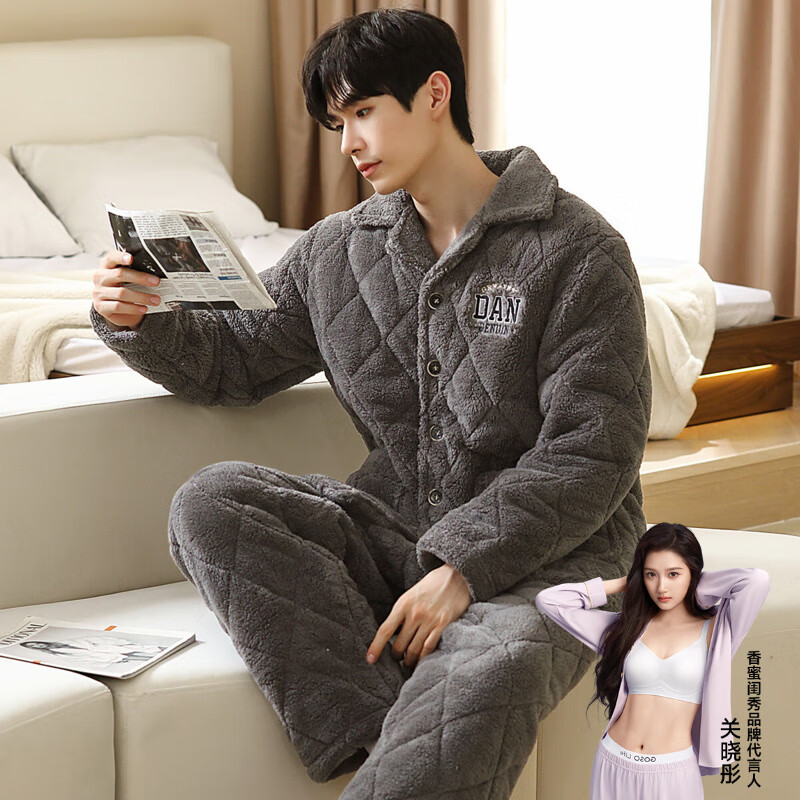¥89 香蜜闺秀【三层夹棉加厚】男士睡衣秋冬新款长袖可外穿保暖男士家居服套装 W3424013深灰 XL 289