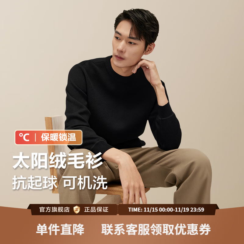 ¥149 红豆【太阳绒】旷野美拉德针织衫男可机洗加绒毛衣男黑色打底衫毛衫男 【加绒圆领】S1墨玉黑 M 46 【推荐115-130斤】 259