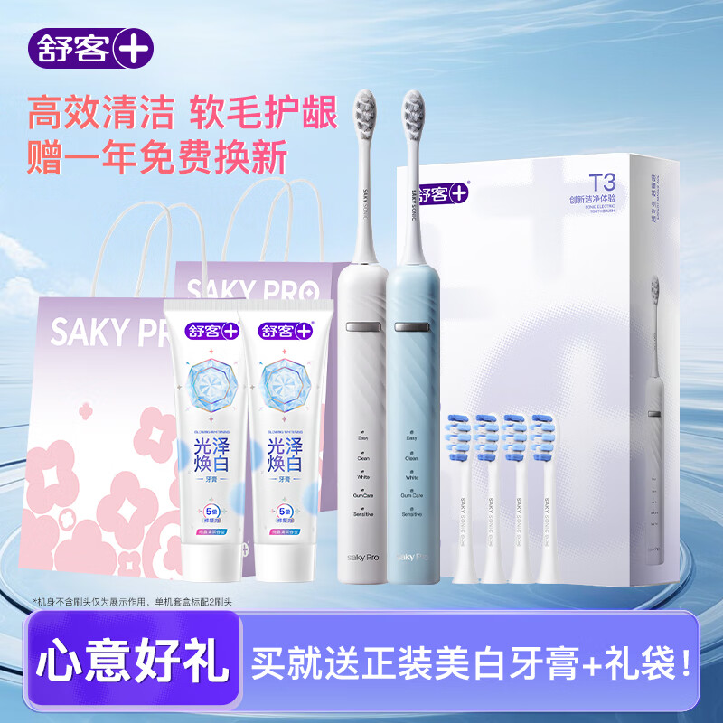 ¥158 舒客【情侣装】【好事礼袋】T3电动牙刷 情侣套装 声波自动充电式成人美白男女送礼 礼物 赠正装牙膏 【情侣双支】T3冰岛白+挪威蓝 268