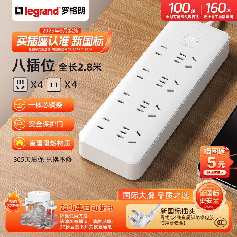 ¥27.9 罗格朗新国标插座插排接线板总控接线板插排插板插座面板 【新国标防过载】总控4位5孔+4位2孔-2.8米 37.9