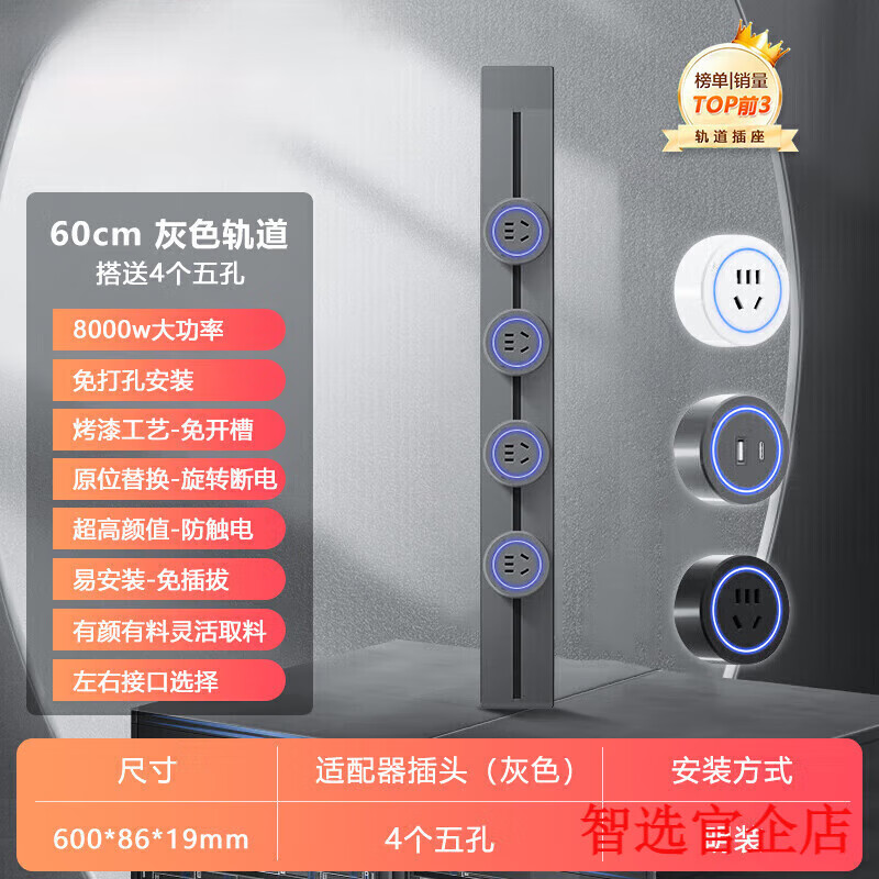 ¥158 小米部依轨道插座德国品质电工可移动轨道插座明装式电力滑动导轨电源客厅 灰色60cm轨道(五孔-带灯*4) 238